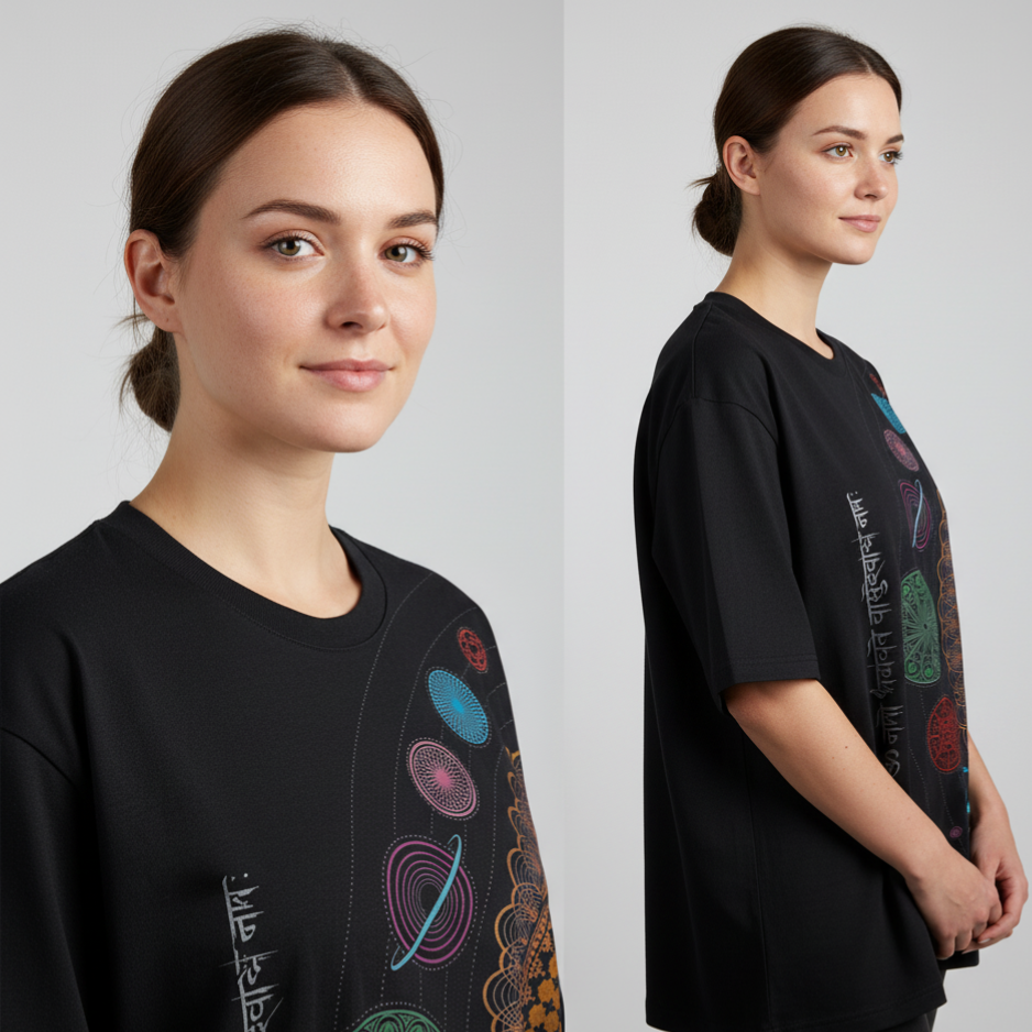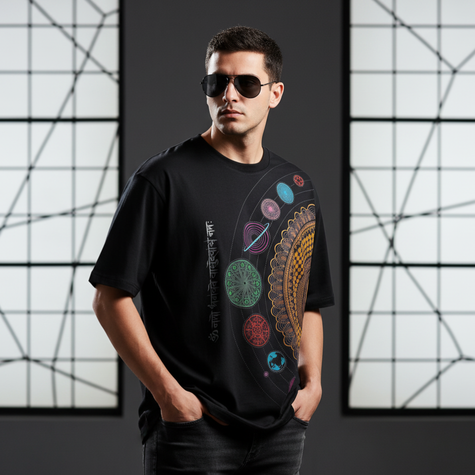 Step into cosmic vibes with this Black Cosmic Mandala Oversized T-Shirt. Featuring a golden mandala, planetary orbits, and the sacred mantra “ॐ नमो भगवते वासुदेवाय”, this tee blends spirituality with modern streetwear. Made from 100% premium cotton, it offers breathable comfort and a relaxed oversized fit — ideal for college, travel, yoga, or just everyday chill.